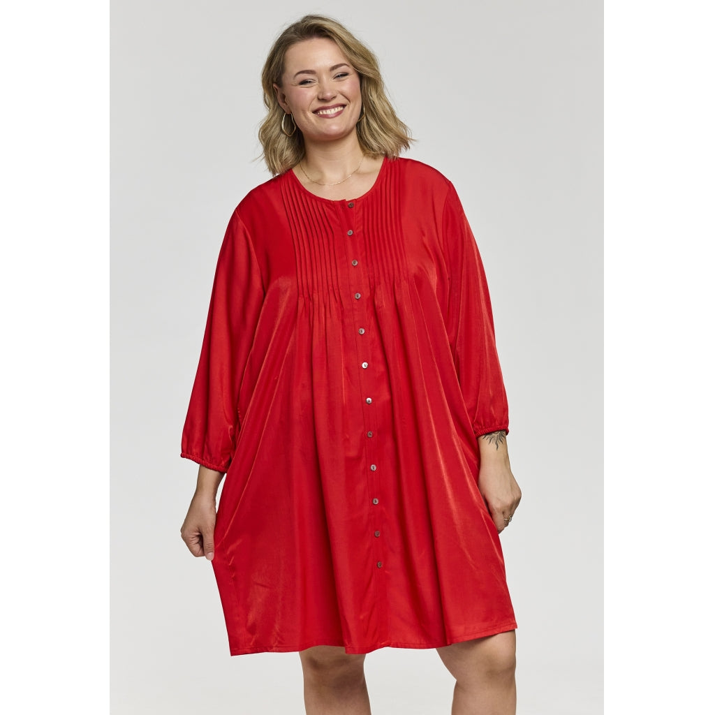 Feines, langes Kleid aus einer Viskose-Nylon-Mischung mit blauem und gräulichem Aquarell-Druck. Das Kleid hat einen Chinakragen, einen durchgehenden Knopfverschluss, lange Ärmel und Seitentaschen. Mit seitlichen Schlitzen und dekorativen Falten auf der Rückseite.